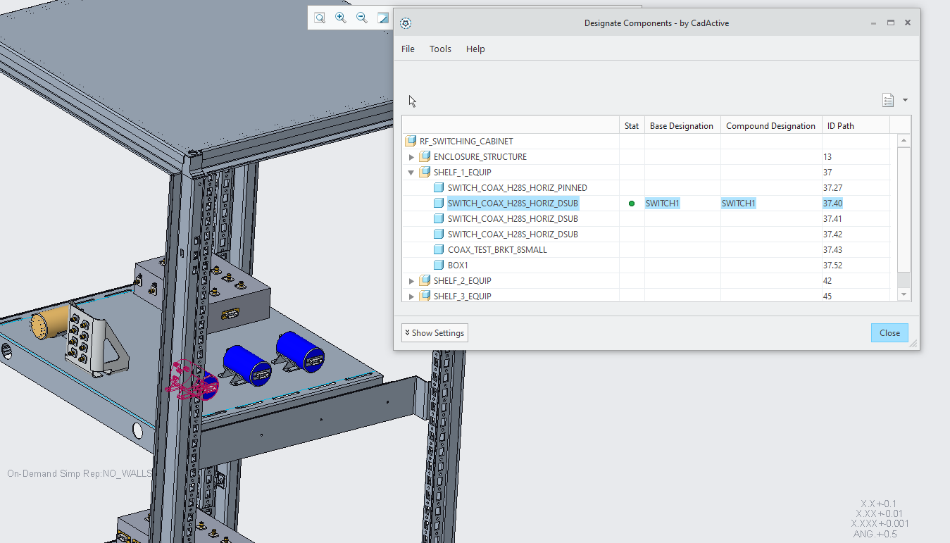 First, use the Designator to designate the assembly components you plan to copy references from into the skeleton model. In the below example, I designate one of the blue switches as SWITCH1, but do not designate the other two.